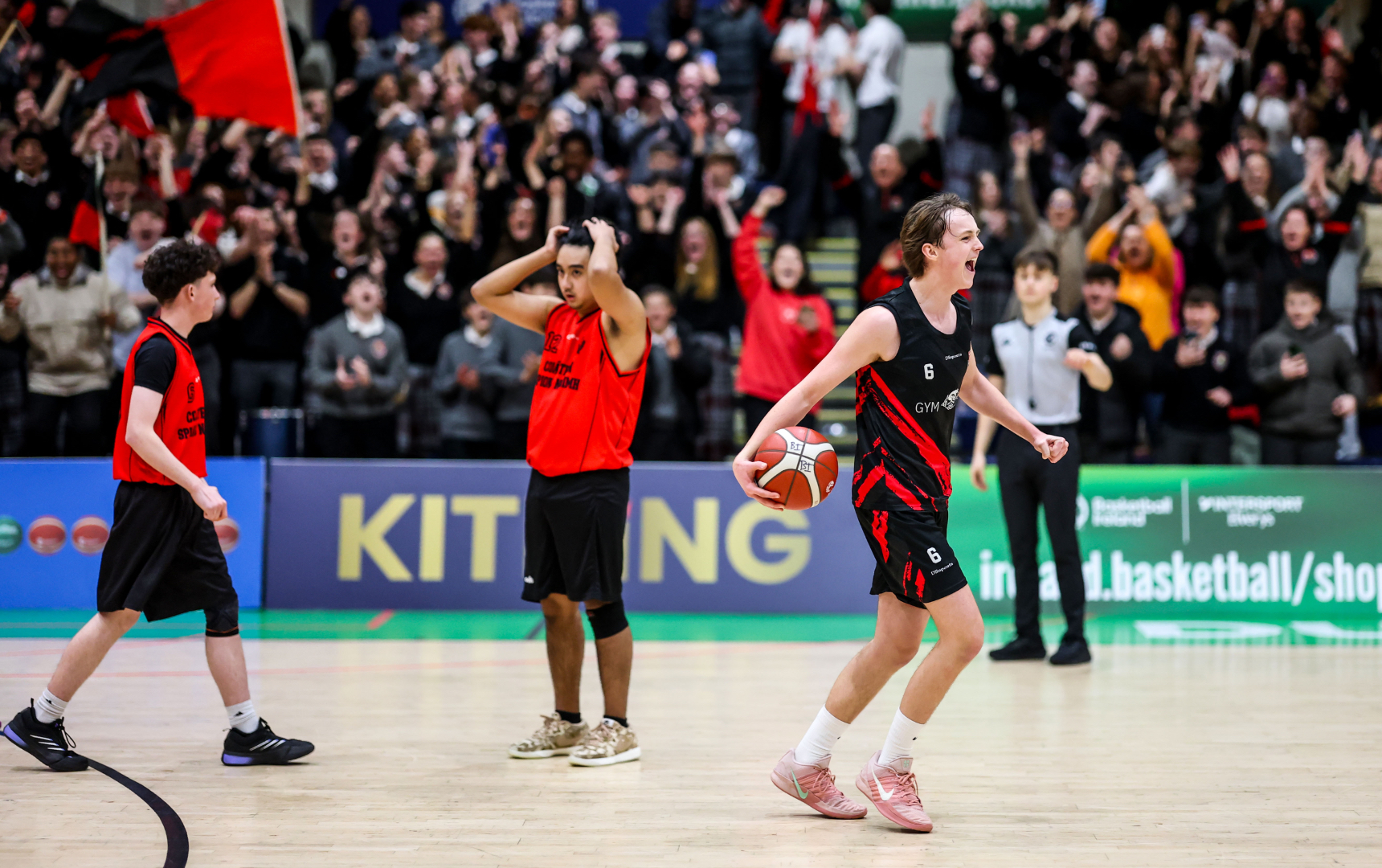 Kildare Town's Charlie Dunny celebrating on the court in the U19 'B' Boys All-Ireland Schools Cup final in the National Basketball Arena