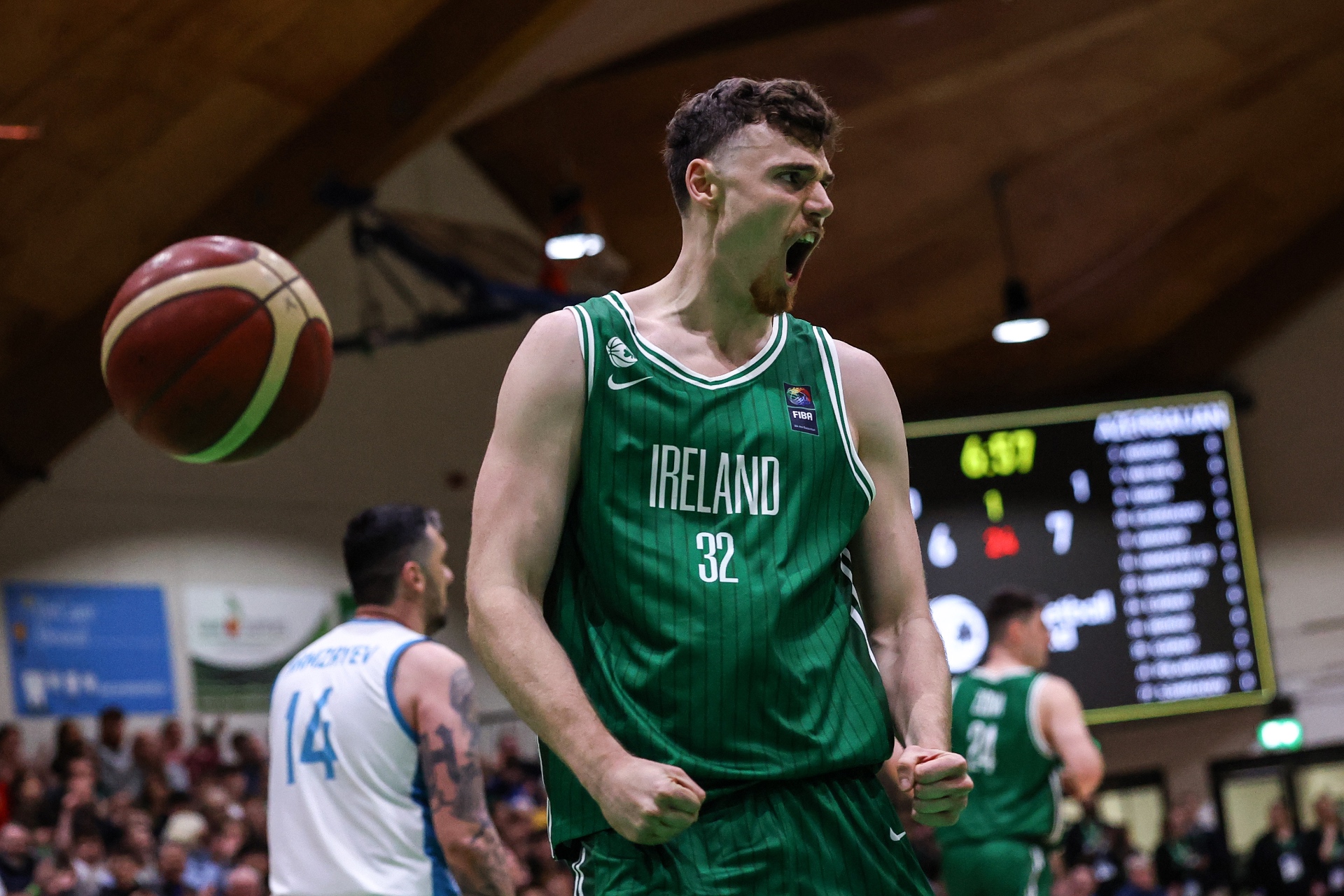 Neal Quinn celebrates after a dunk in the FIBA EuroBasket 2029 Pre-Qualifiers against Azerbaijan at the National Basketball Arena
