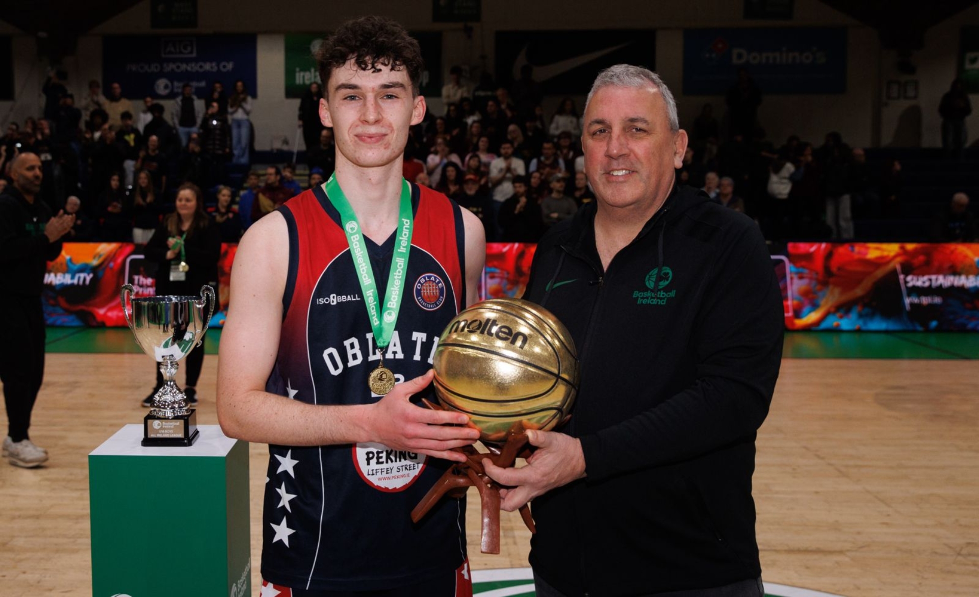 John Walsh, Basketball Ireland National League Manager, presents the U18 Boys All-Ireland League Final MVP award to Oblates player Augustine Farrell